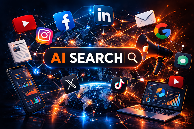 AI search is a retrieval and synthesis layer that pulls from multiple web sources, then composes an answer instead of showing a simple ranked list. That changes visibility from page-level ranking to ecosystem-level presence.